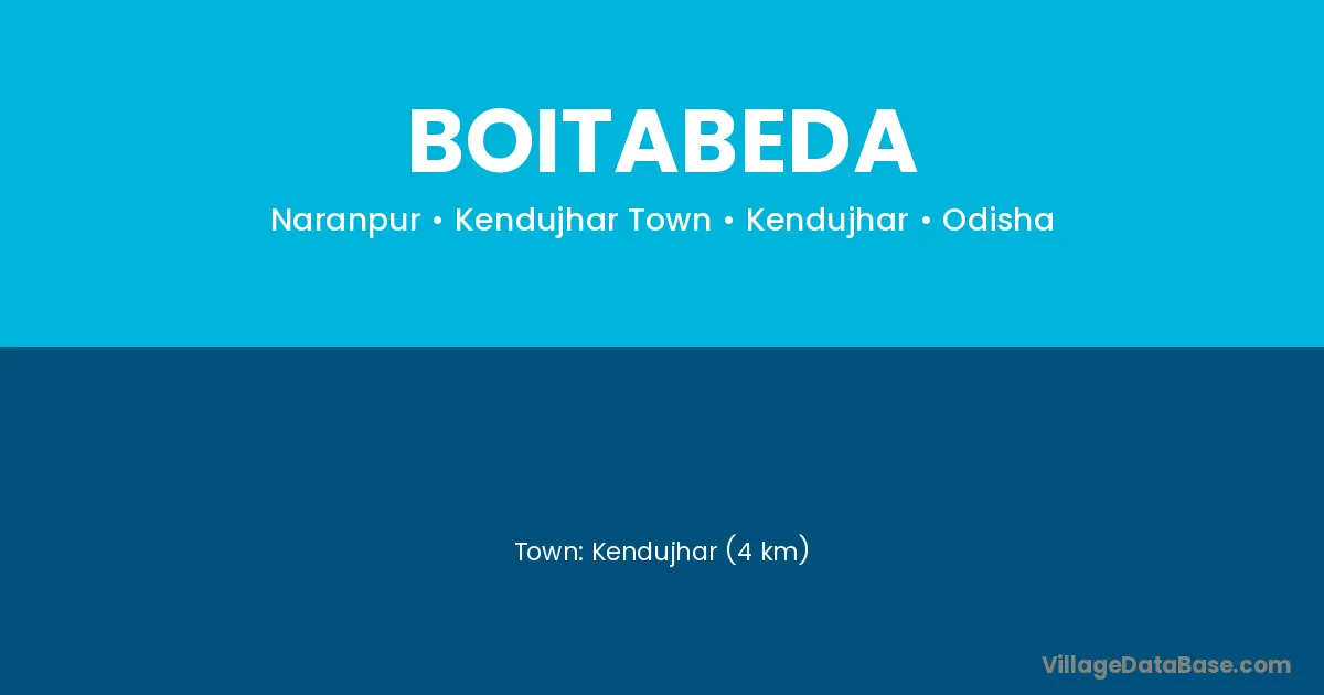 Kendujhar (4 km) is the nearest town to Boitabeda village for major economic activities and is located approximately 4 km away.