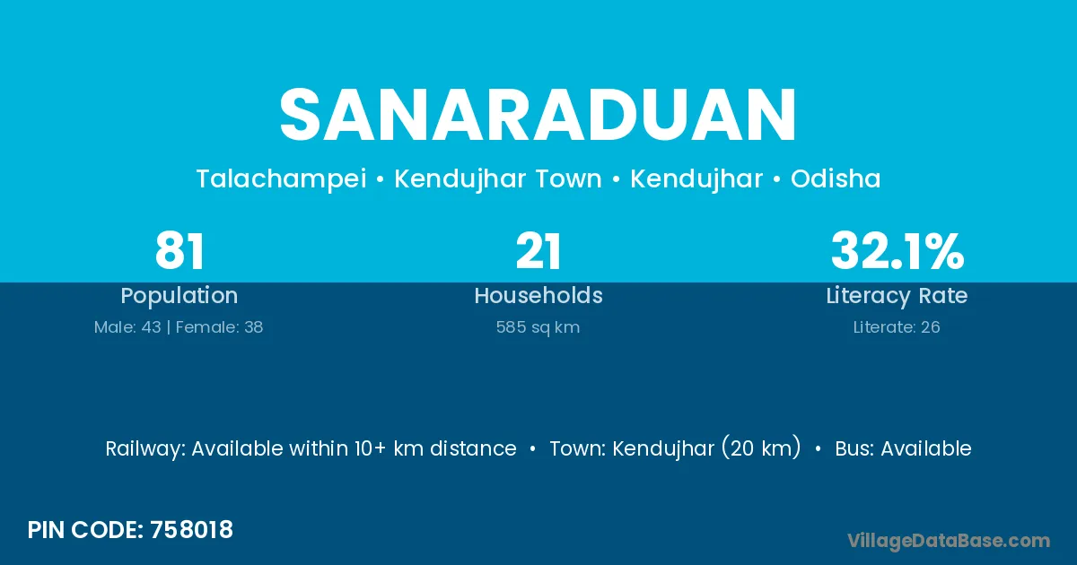 Kendujhar (20 km) is the nearest town to Sanaraduan village for major economic activities and is located approximately 20 km away.