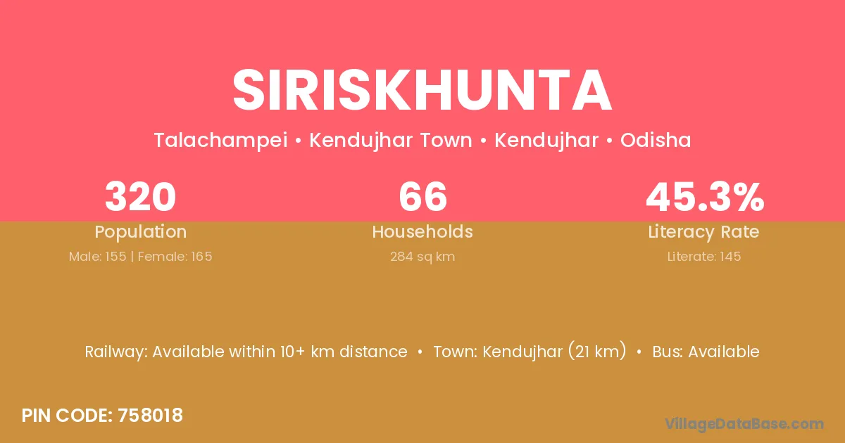 Kendujhar (21 km) is the nearest town to Siriskhunta village for major economic activities and is located approximately 21 km away.