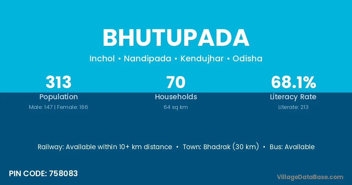 Bhadrak (30 km) is the nearest town to Bhutupada village for major economic activities and is located approximately 30 km away.