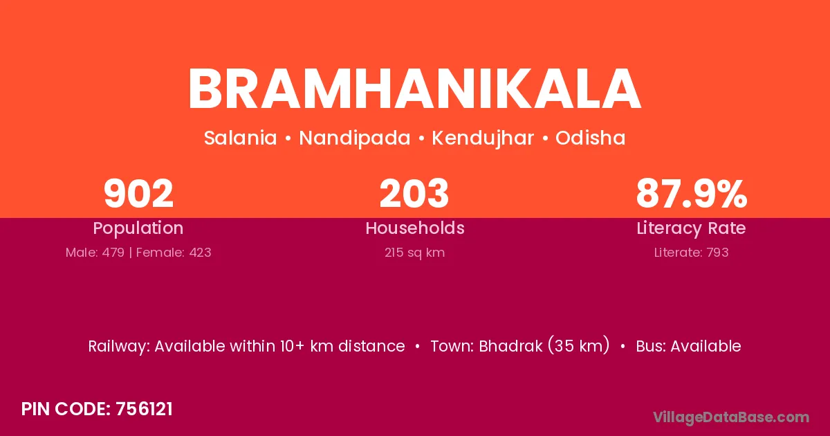 Bramhanikala village has a total population of 902 people, of which 479 are males and 423 are females.