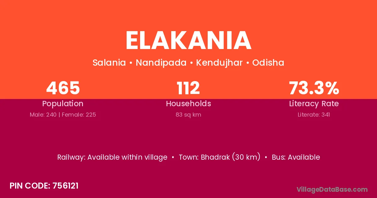 Bhadrak (30 km) is the nearest town to Elakania village for major economic activities and is located approximately 30 km away.