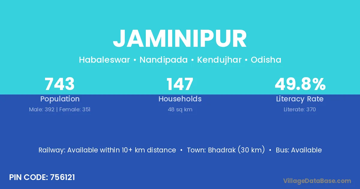 Bhadrak (30 km) is the nearest town to Jaminipur village for major economic activities and is located approximately 30 km away.