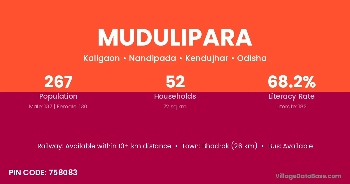 Bhadrak (26 km) is the nearest town to Mudulipara village for major economic activities and is located approximately 26 km away.
