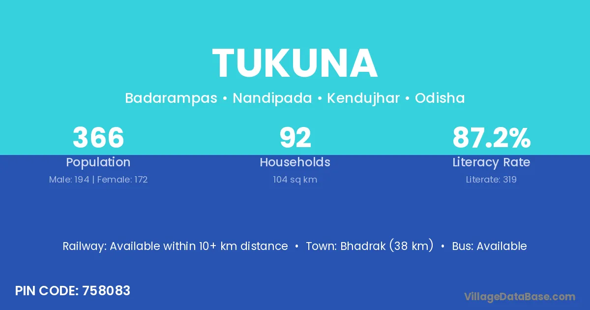 Bhadrak (38 km) is the nearest town to Tukuna village for major economic activities and is located approximately 38 km away.