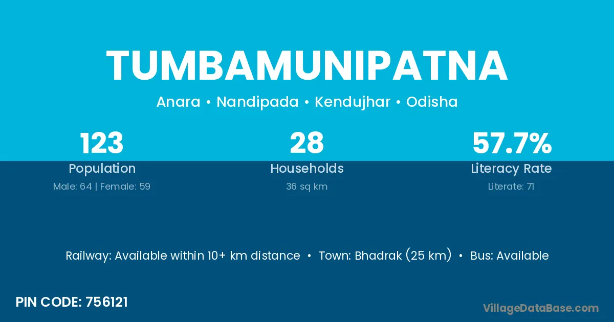 Tumbamunipatna village has a total population of 123 people, of which 64 are males and 59 are females.