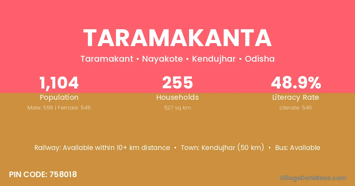 Taramakanta village has a total population of 1,104 people, of which 559 are males and 545 are females.