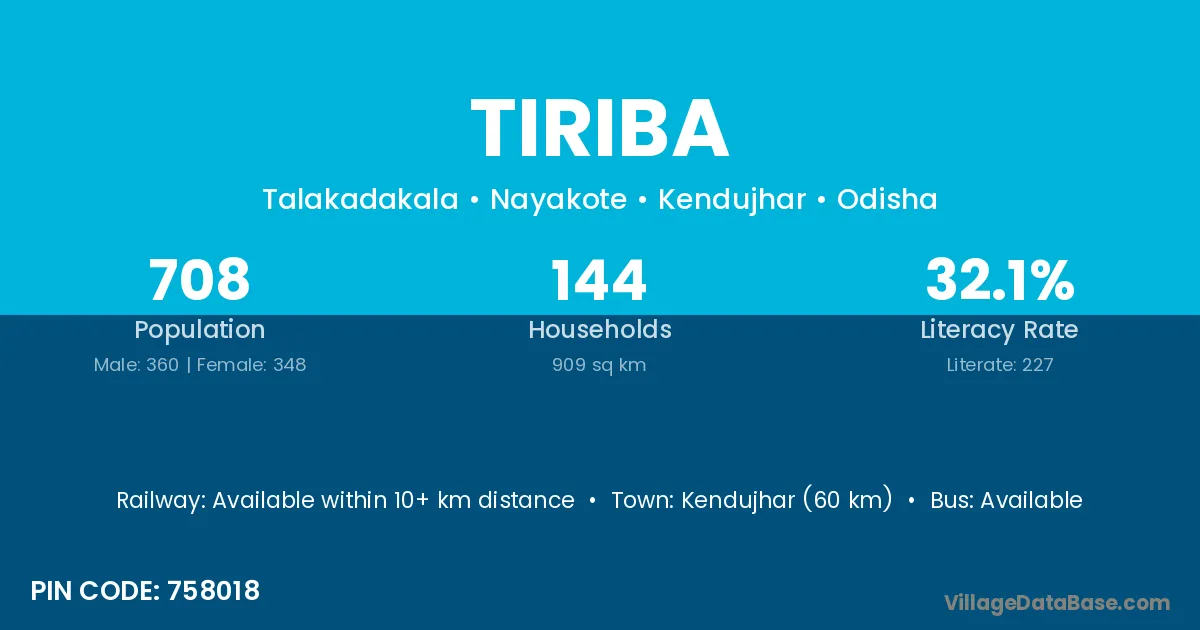 Kendujhar (60 km) is the nearest town to Tiriba village for major economic activities and is located approximately 60 km away.