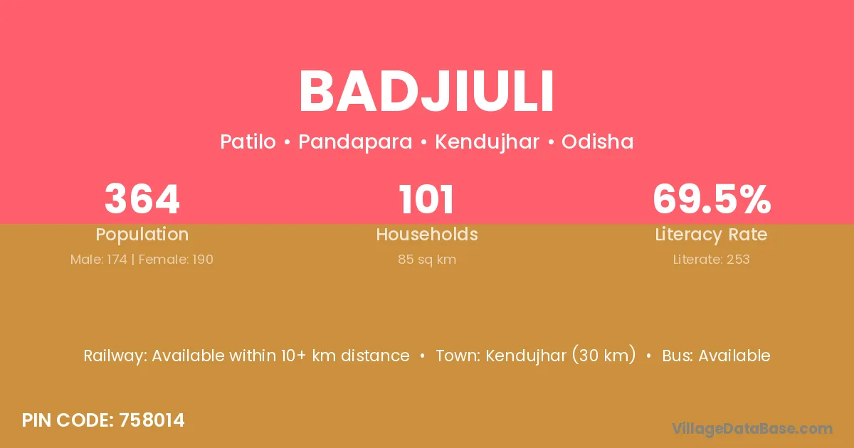 Kendujhar (30 km) is the nearest town to Badjiuli village for major economic activities and is located approximately 30 km away.