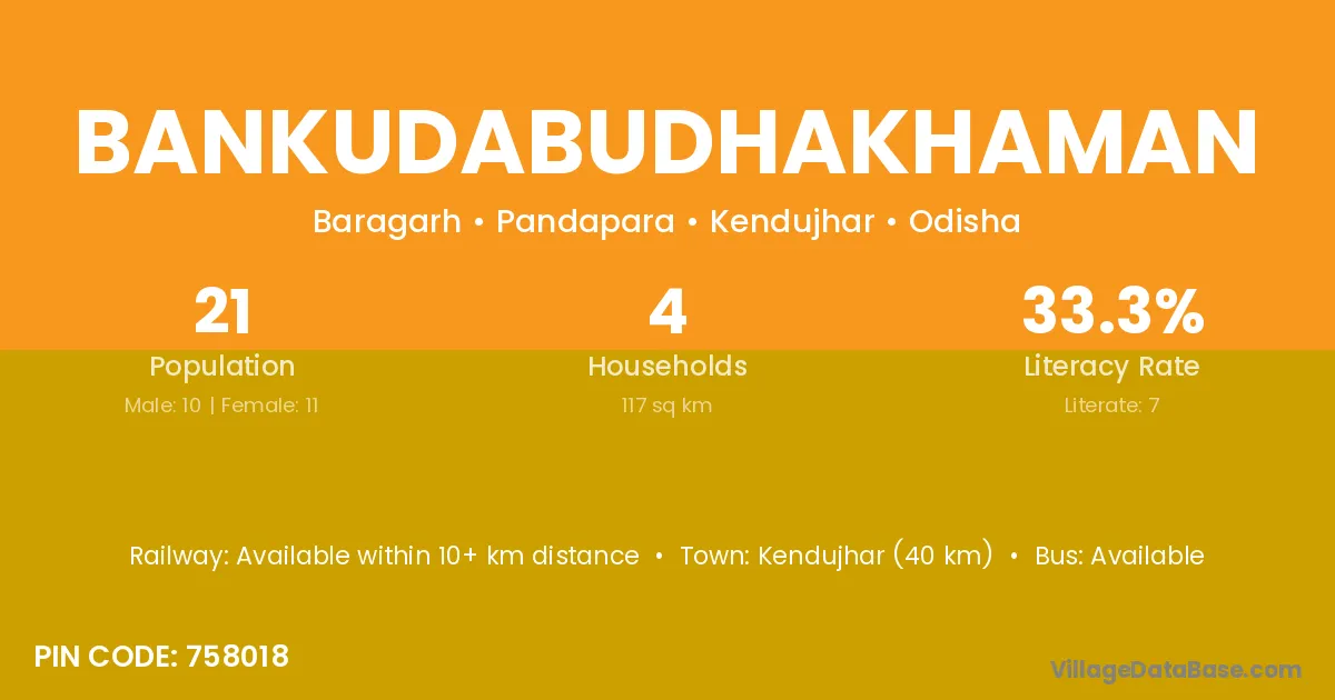 Bankudabudhakhaman village has a total population of 21 people, of which 10 are males and 11 are females.