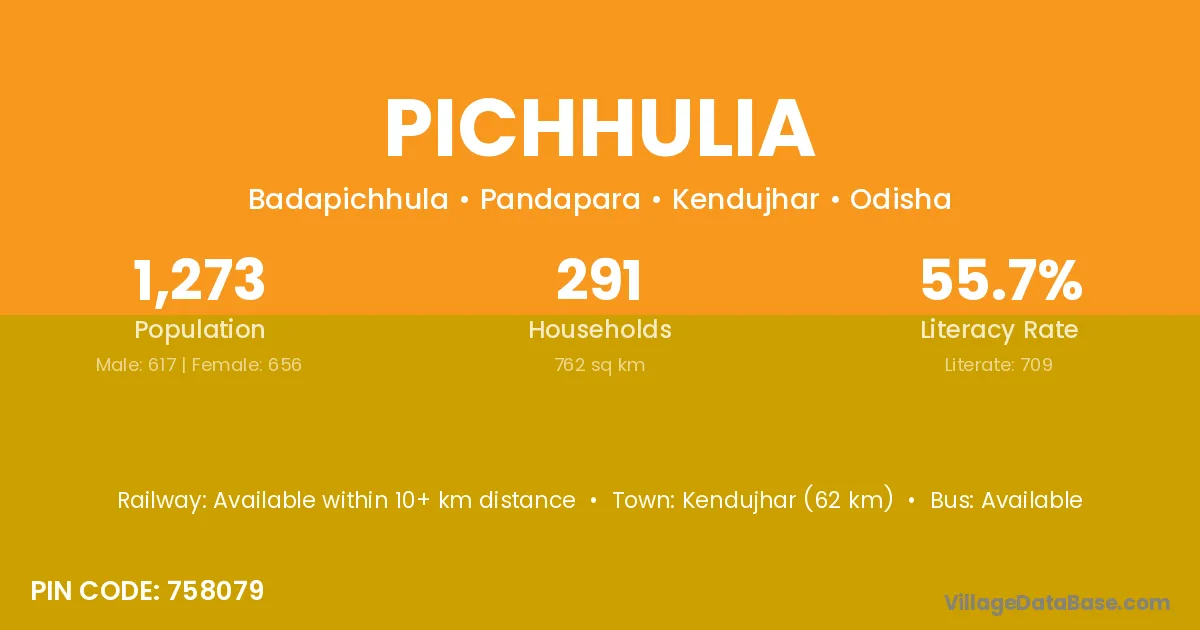 Kendujhar (62 km) is the nearest town to Pichhulia village for major economic activities and is located approximately 62 km away.