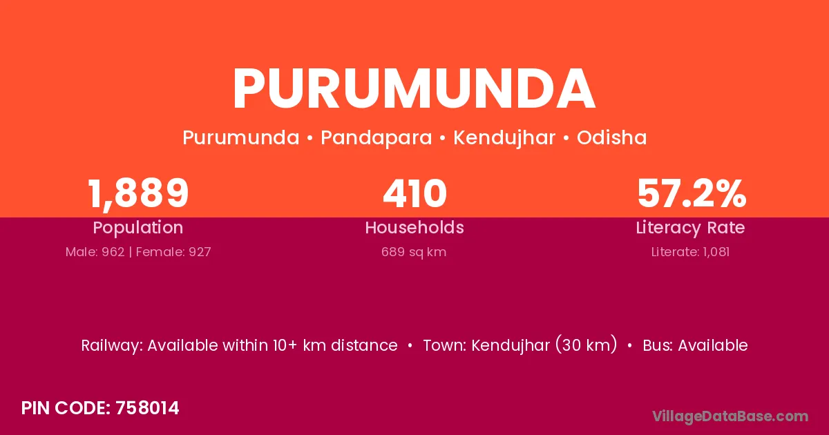 Kendujhar (30 km) is the nearest town to Purumunda village for major economic activities and is located approximately 30 km away.