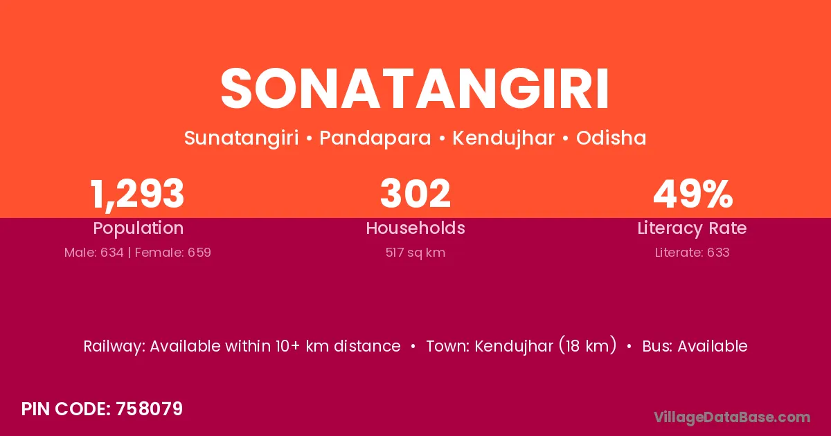 Sonatangiri village has a total population of 1,293 people, of which 634 are males and 659 are females.