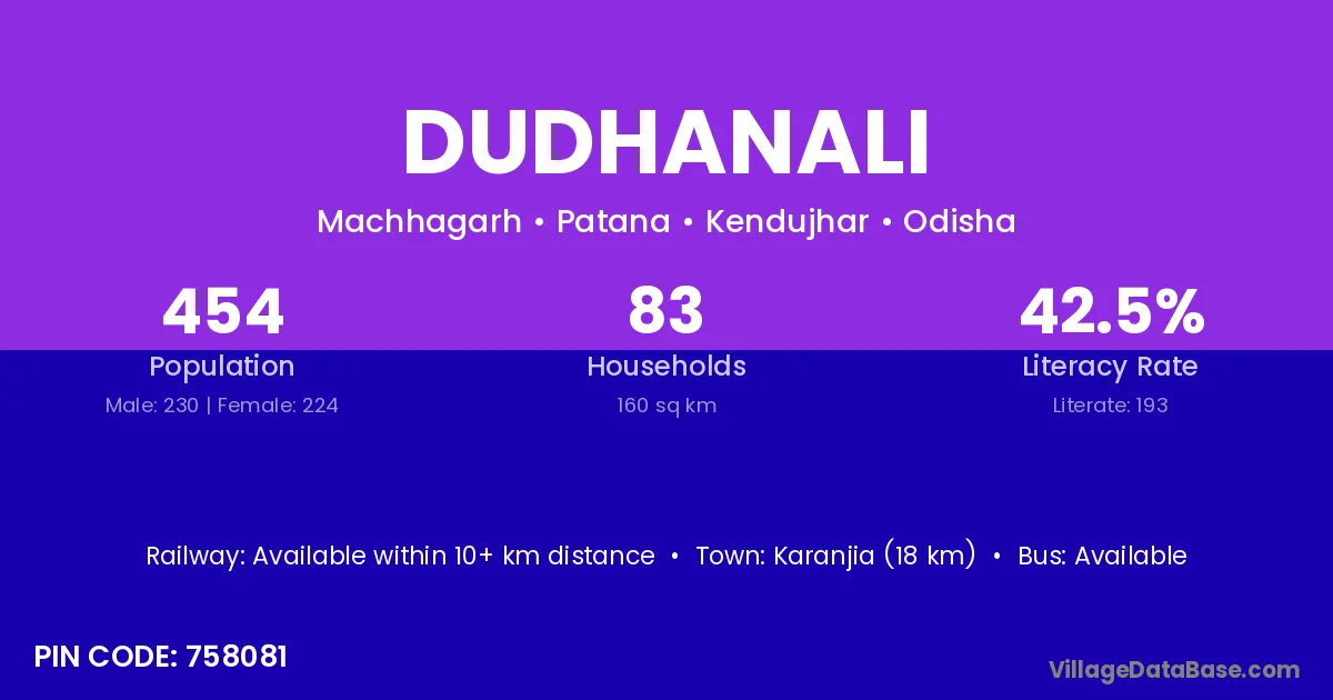 Karanjia (18 km) is the nearest town to Dudhanali village for major economic activities and is located approximately 18 km away.