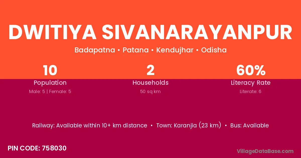 Dwitiya Sivanarayanpur village has a total population of 10 people, of which 5 are males and 5 are females.