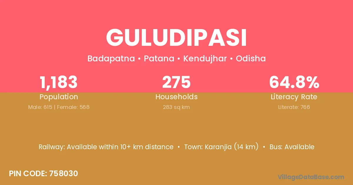 Karanjia (14 km) is the nearest town to Guludipasi village for major economic activities and is located approximately 14 km away.