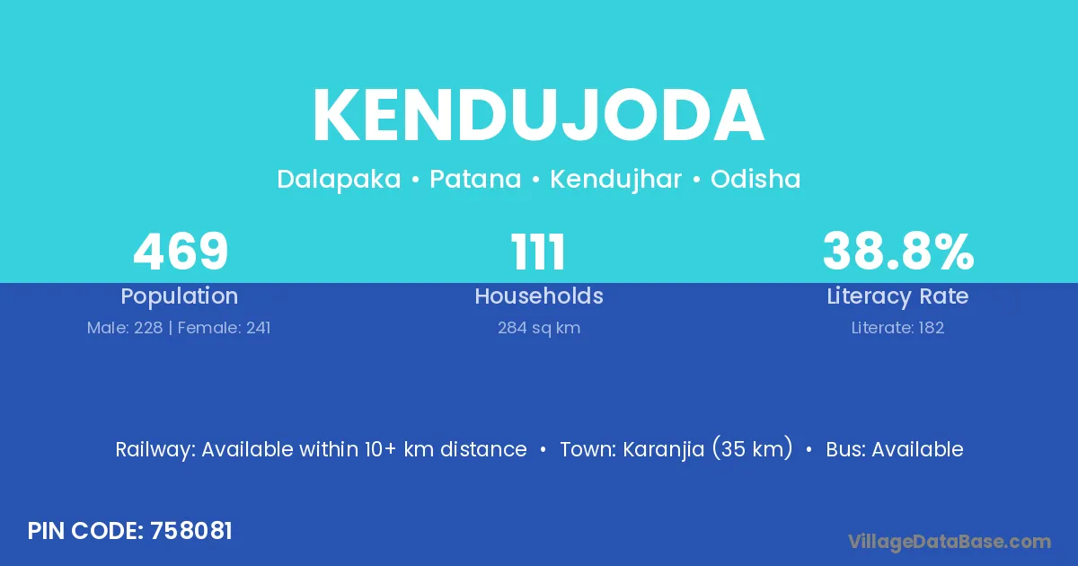 Karanjia (35 km) is the nearest town to Kendujoda village for major economic activities and is located approximately 35 km away.