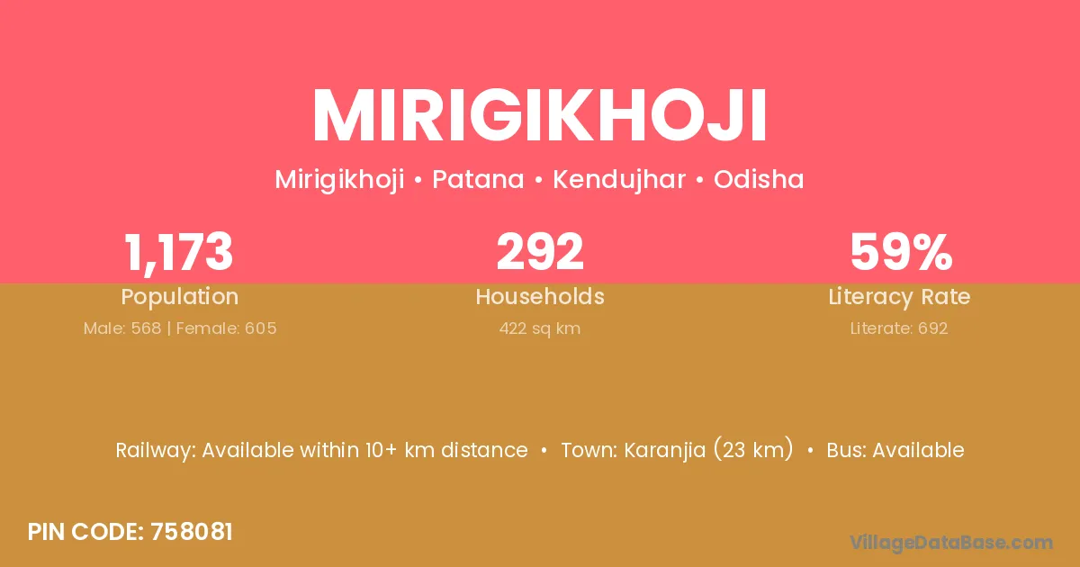 Karanjia (23 km) is the nearest town to Mirigikhoji village for major economic activities and is located approximately 23 km away.