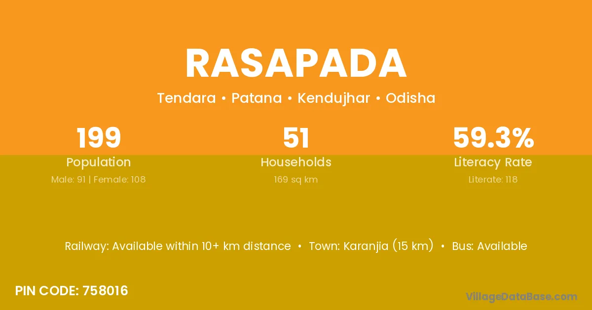 Karanjia (15 km) is the nearest town to Rasapada village for major economic activities and is located approximately 15 km away.