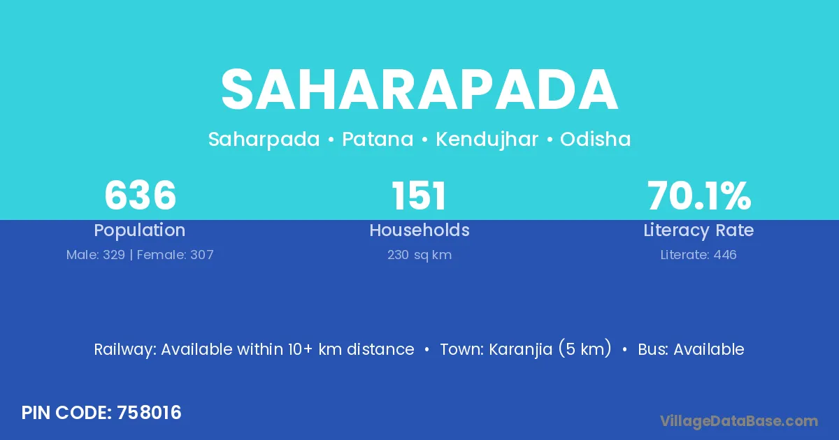 Karanjia (5 km) is the nearest town to Saharapada village for major economic activities and is located approximately 5 km away.
