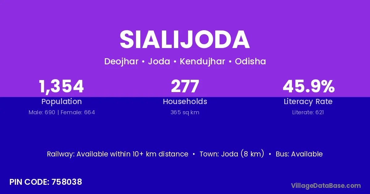 Karanjia (15 km) is the nearest town to Sialijoda village for major economic activities and is located approximately 15 km away.