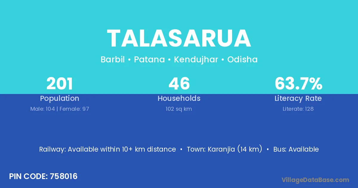 Karanjia (14 km) is the nearest town to Talasarua village for major economic activities and is located approximately 14 km away.