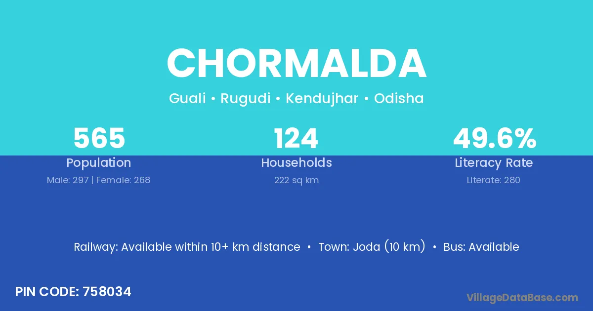 Joda (10 km) is the nearest town to Chormalda village for major economic activities and is located approximately 10 km away.