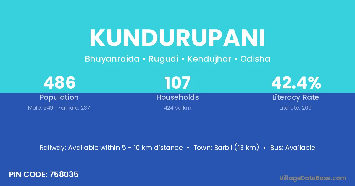 Barbil (13 km) is the nearest town to Kundurupani village for major economic activities and is located approximately 13 km away.