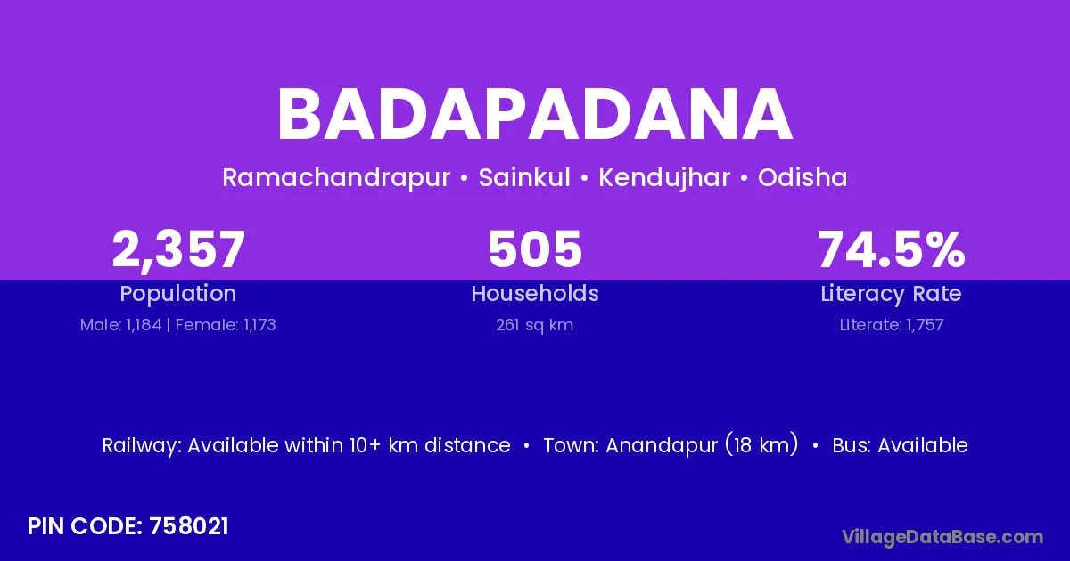 Anandapur (18 km) is the nearest town to Badapadana village for major economic activities and is located approximately 18 km away.