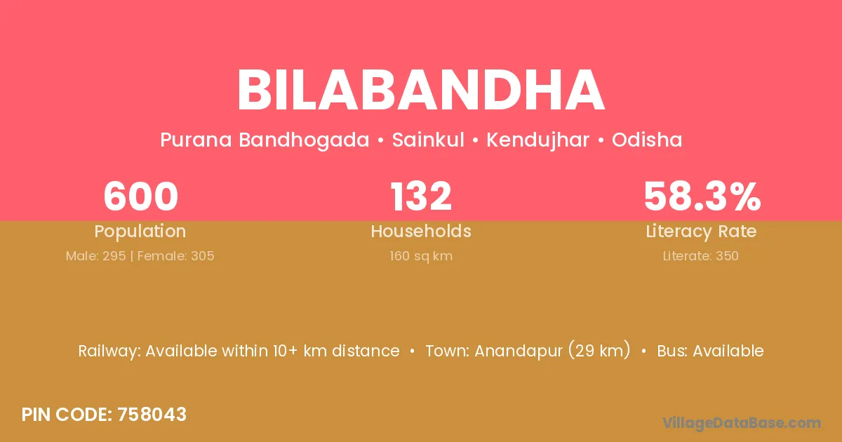 Bilabandha village has a total population of 600 people, of which 295 are males and 305 are females.