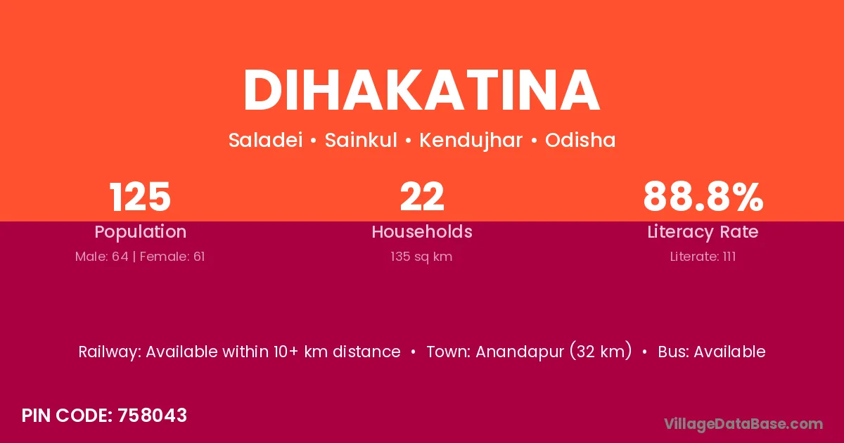 Anandapur (32 km) is the nearest town to Dihakatina village for major economic activities and is located approximately 32 km away.