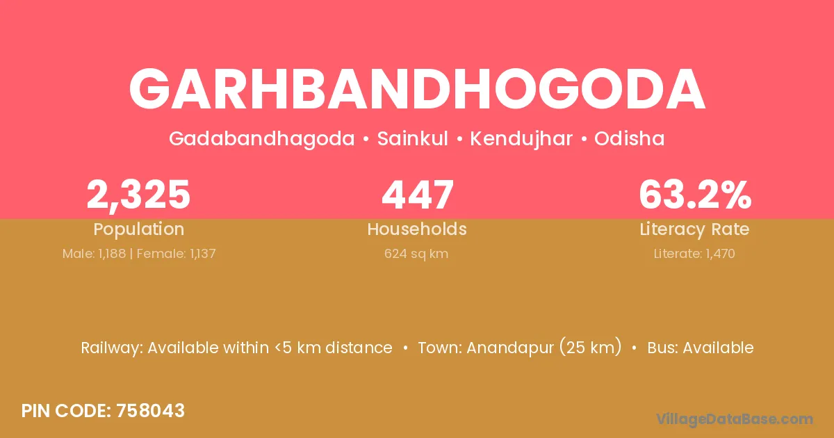 Anandapur (25 km) is the nearest town to Garhbandhogoda village for major economic activities and is located approximately 25 km away.