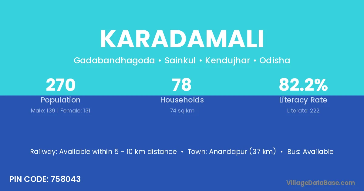 Anandapur (37 km) is the nearest town to Karadamali village for major economic activities and is located approximately 37 km away.