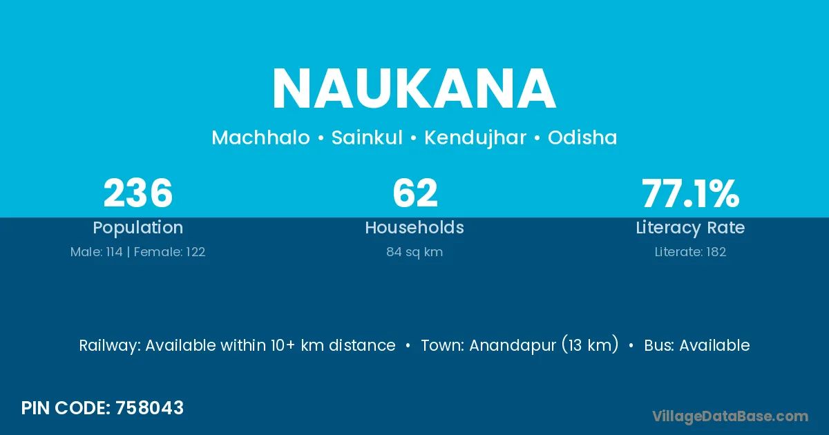 Anandapur (13 km) is the nearest town to Naukana village for major economic activities and is located approximately 13 km away.