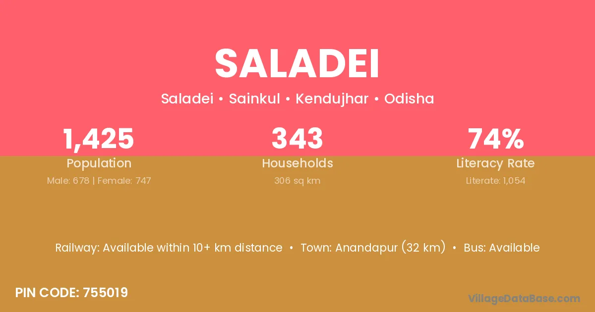 Anandapur (32 km) is the nearest town to Saladei village for major economic activities and is located approximately 32 km away.