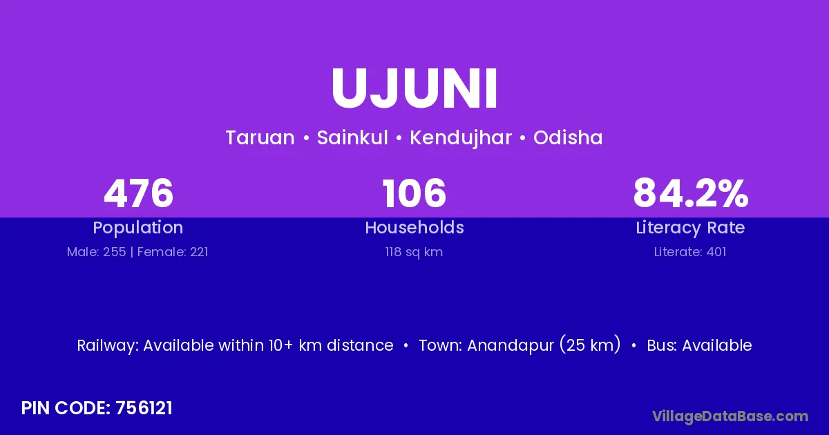 Anandapur (25 km) is the nearest town to Ujuni village for major economic activities and is located approximately 25 km away.