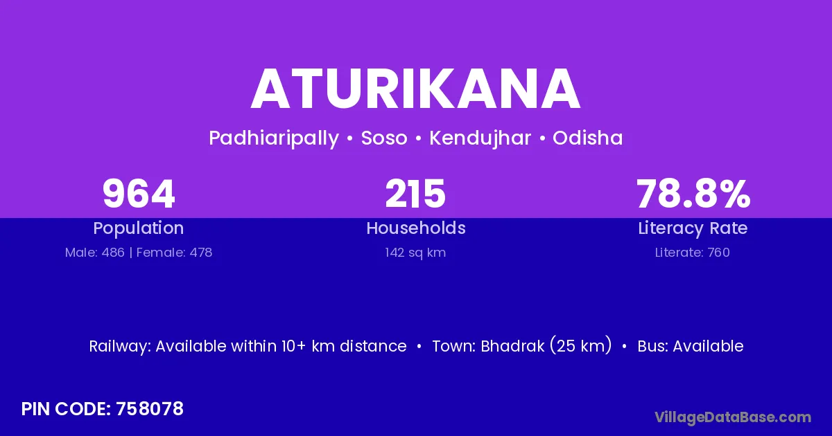 Bhadrak (25 km) is the nearest town to Aturikana village for major economic activities and is located approximately 25 km away.