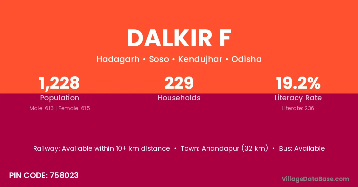 Dalkir F village is located in the Soso Tehsil of the Kendujhar district in Odisha .