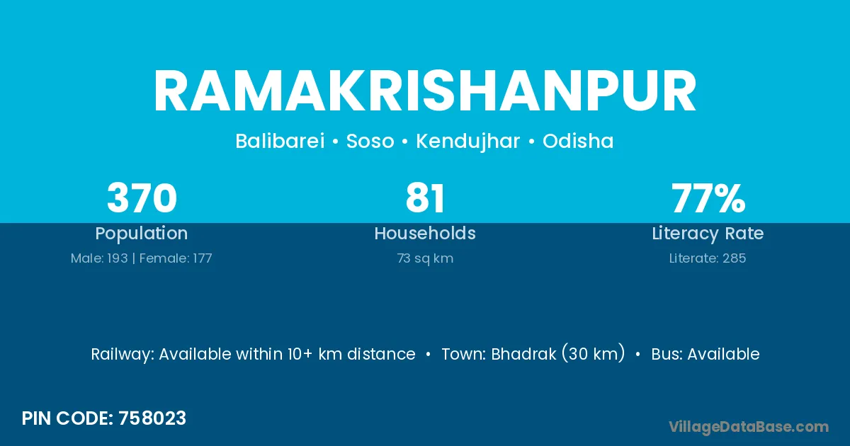 Bhadrak (30 km) is the nearest town to Ramakrishanpur village for major economic activities and is located approximately 30 km away.