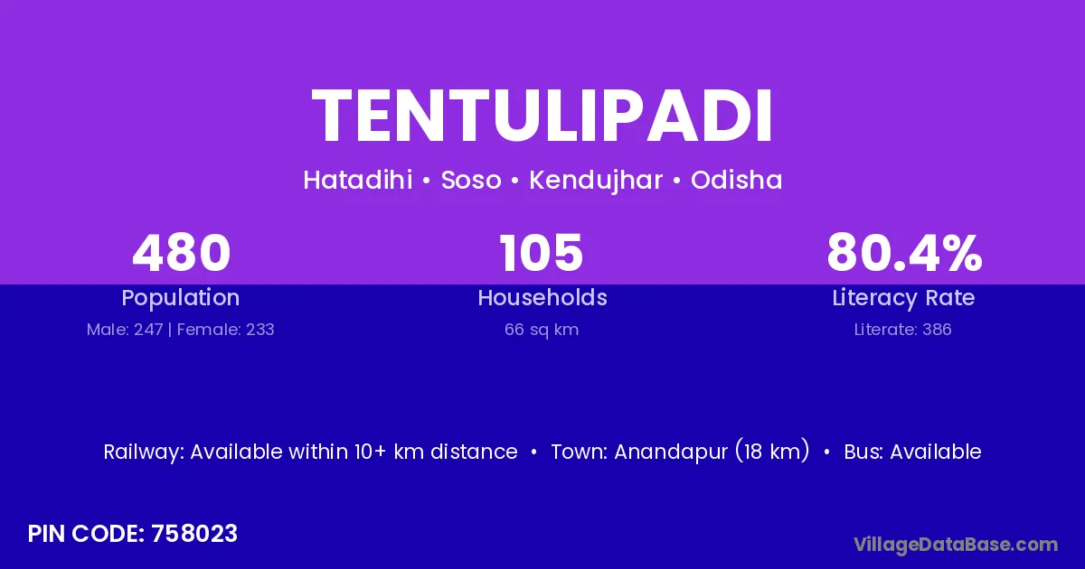 Anandapur (18 km) is the nearest town to Tentulipadi village for major economic activities and is located approximately 18 km away.