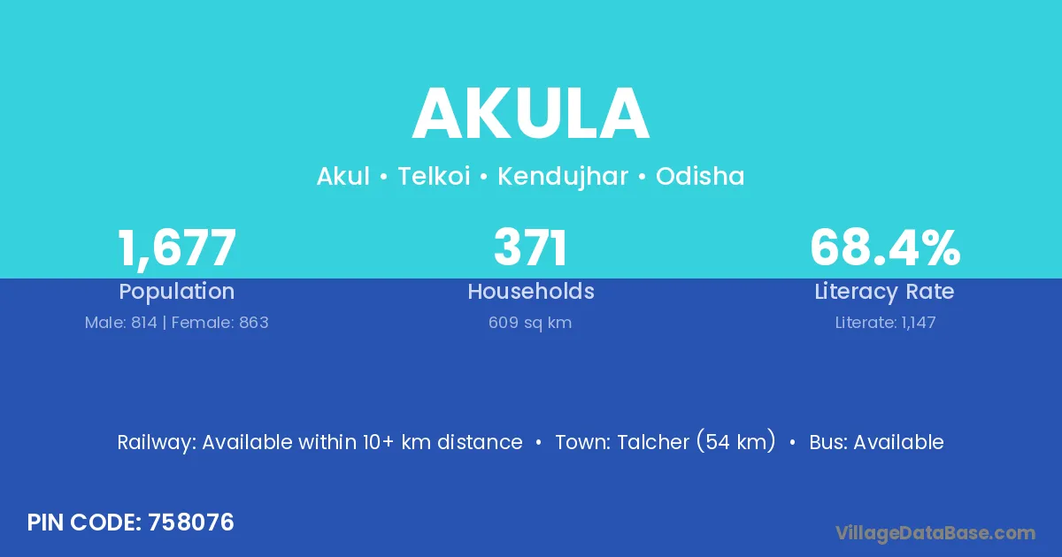 Talcher (54 km) is the nearest town to Akula village for major economic activities and is located approximately 54 km away.