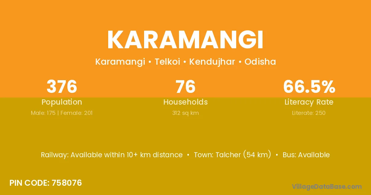 Talcher (54 km) is the nearest town to Karamangi village for major economic activities and is located approximately 54 km away.