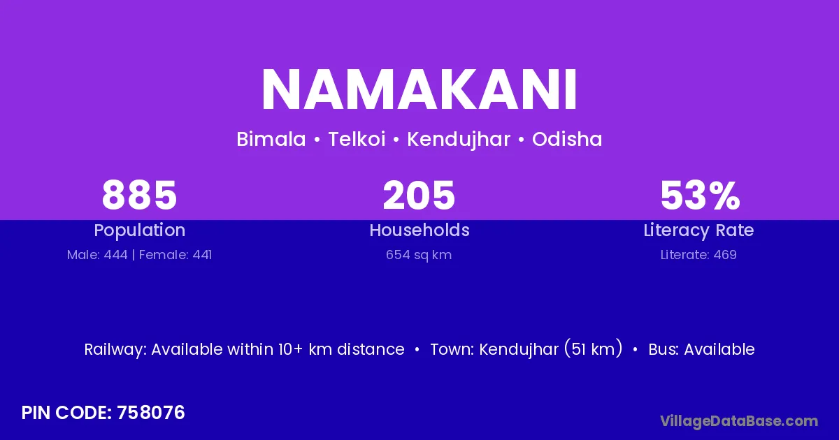 Kendujhar (51 km) is the nearest town to Namakani village for major economic activities and is located approximately 51 km away.