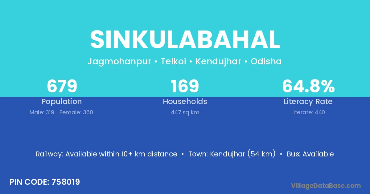 Kendujhar (54 km) is the nearest town to Sinkulabahal village for major economic activities and is located approximately 54 km away.