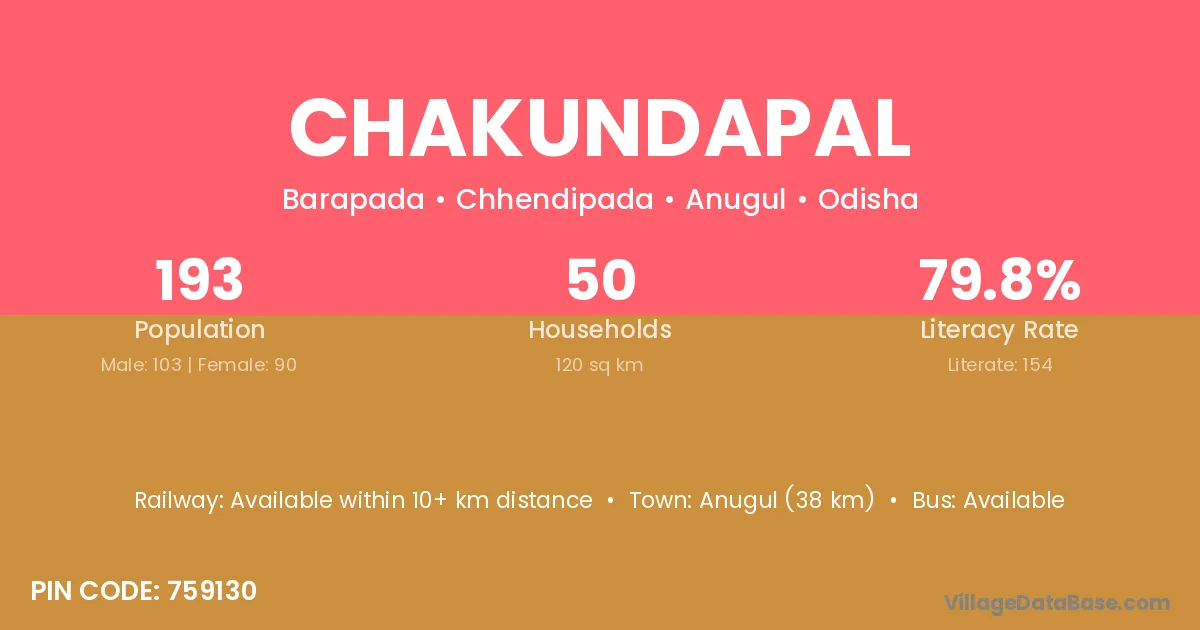 Kendujhar (22 km) is the nearest town to Chakundapal village for major economic activities and is located approximately 22 km away.