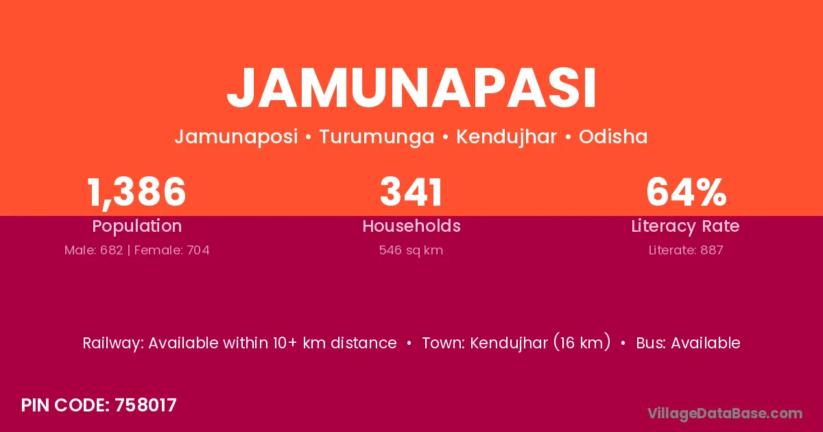 Kendujhar (16 km) is the nearest town to Jamunapasi village for major economic activities and is located approximately 16 km away.
