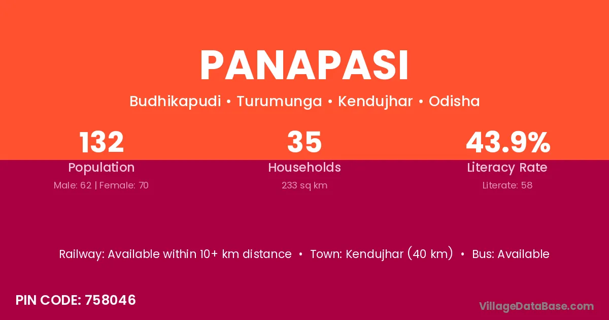 Kendujhar (40 km) is the nearest town to Panapasi village for major economic activities and is located approximately 40 km away.