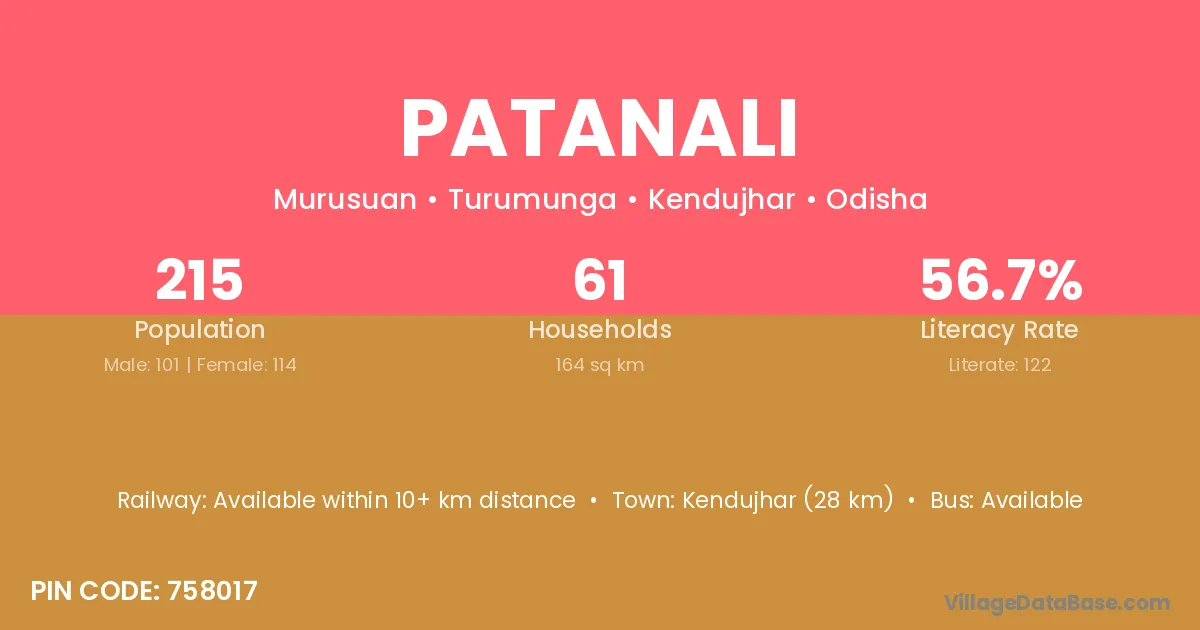 Kendujhar (28 km) is the nearest town to Patanali village for major economic activities and is located approximately 28 km away.