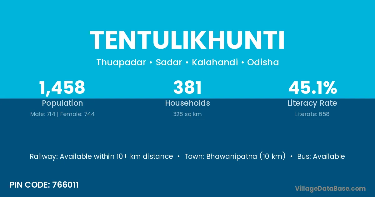 Kendujhar (32 km) is the nearest town to Tentulikhunti village for major economic activities and is located approximately 32 km away.