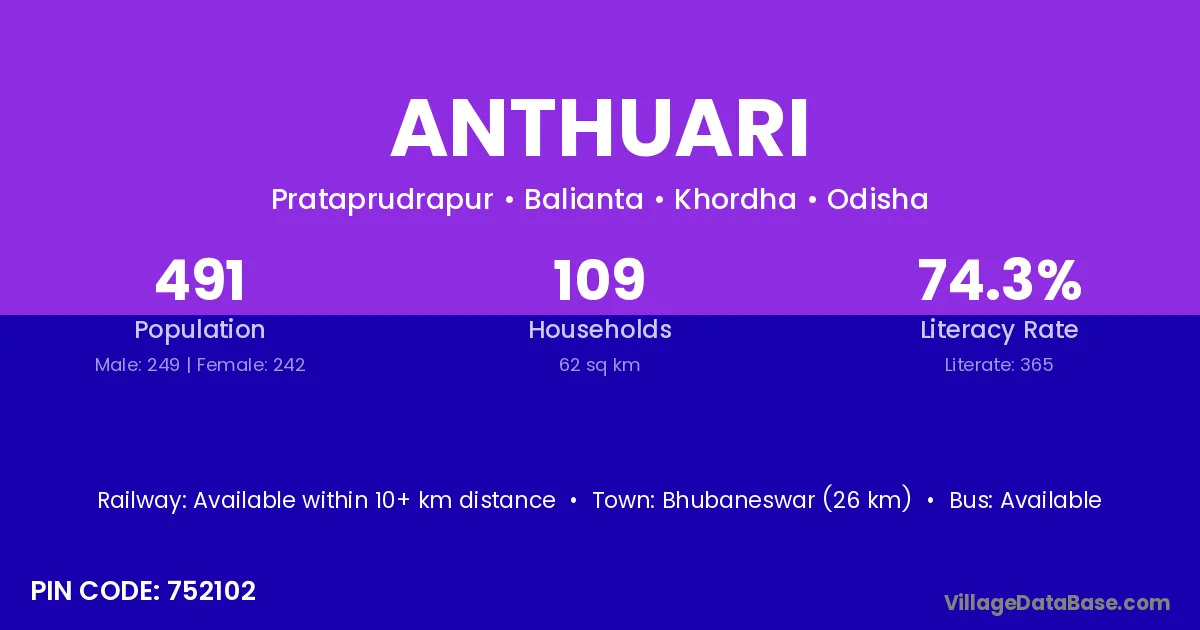 Bhubaneswar (26 km) is the nearest town to Anthuari village for major economic activities and is located approximately 26 km away.